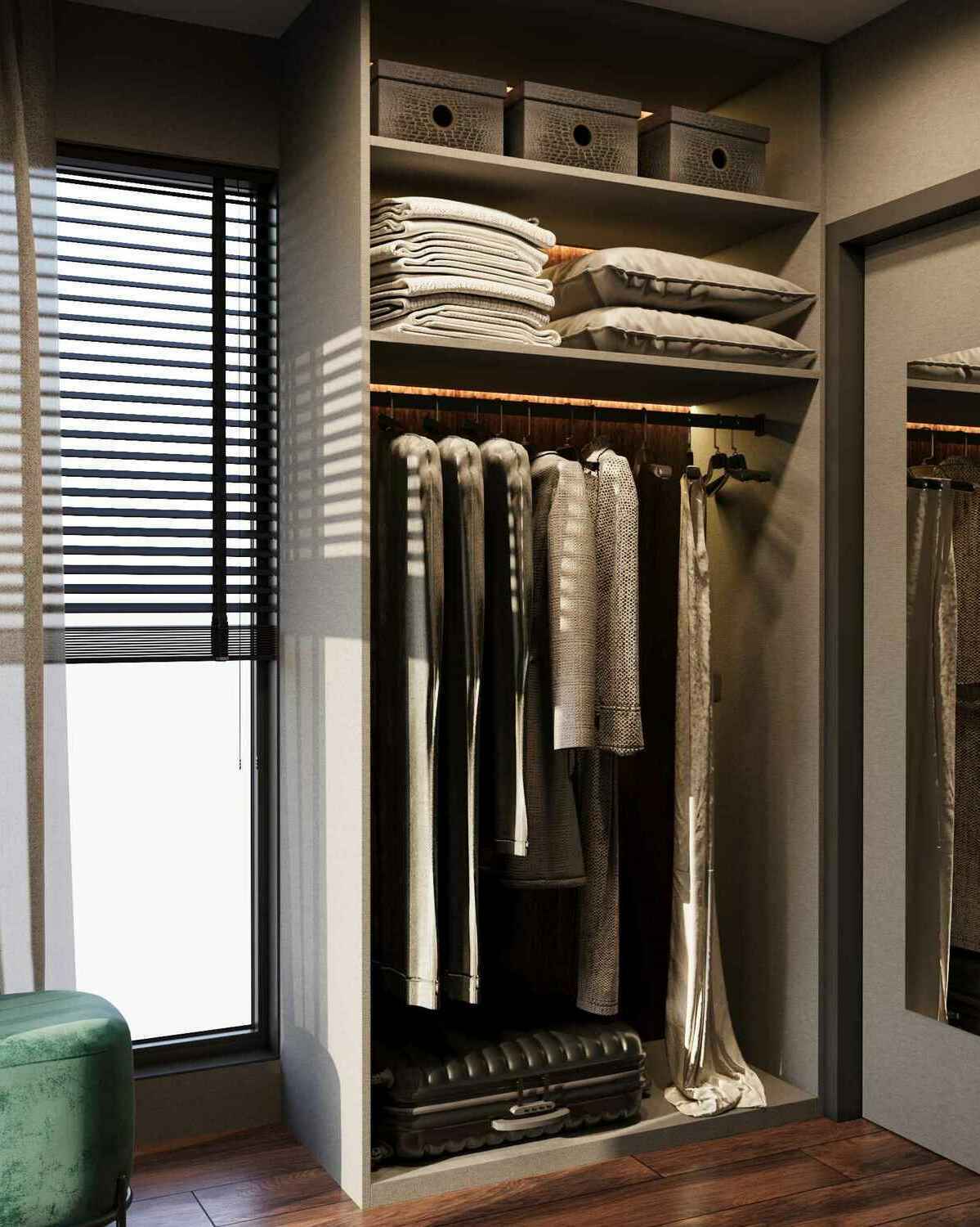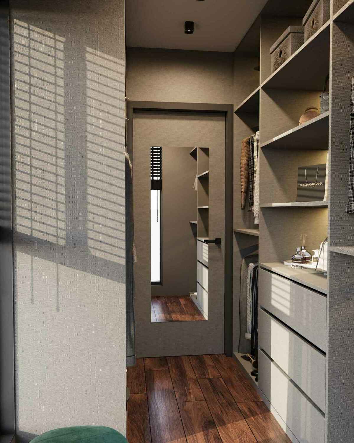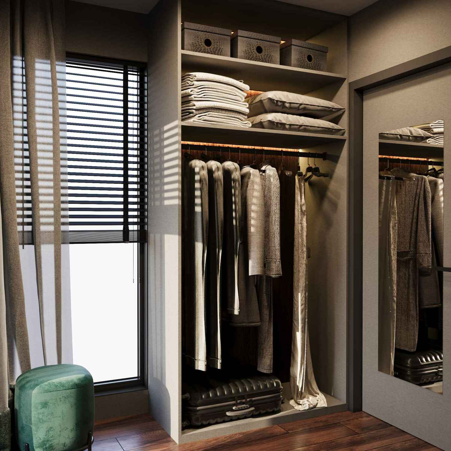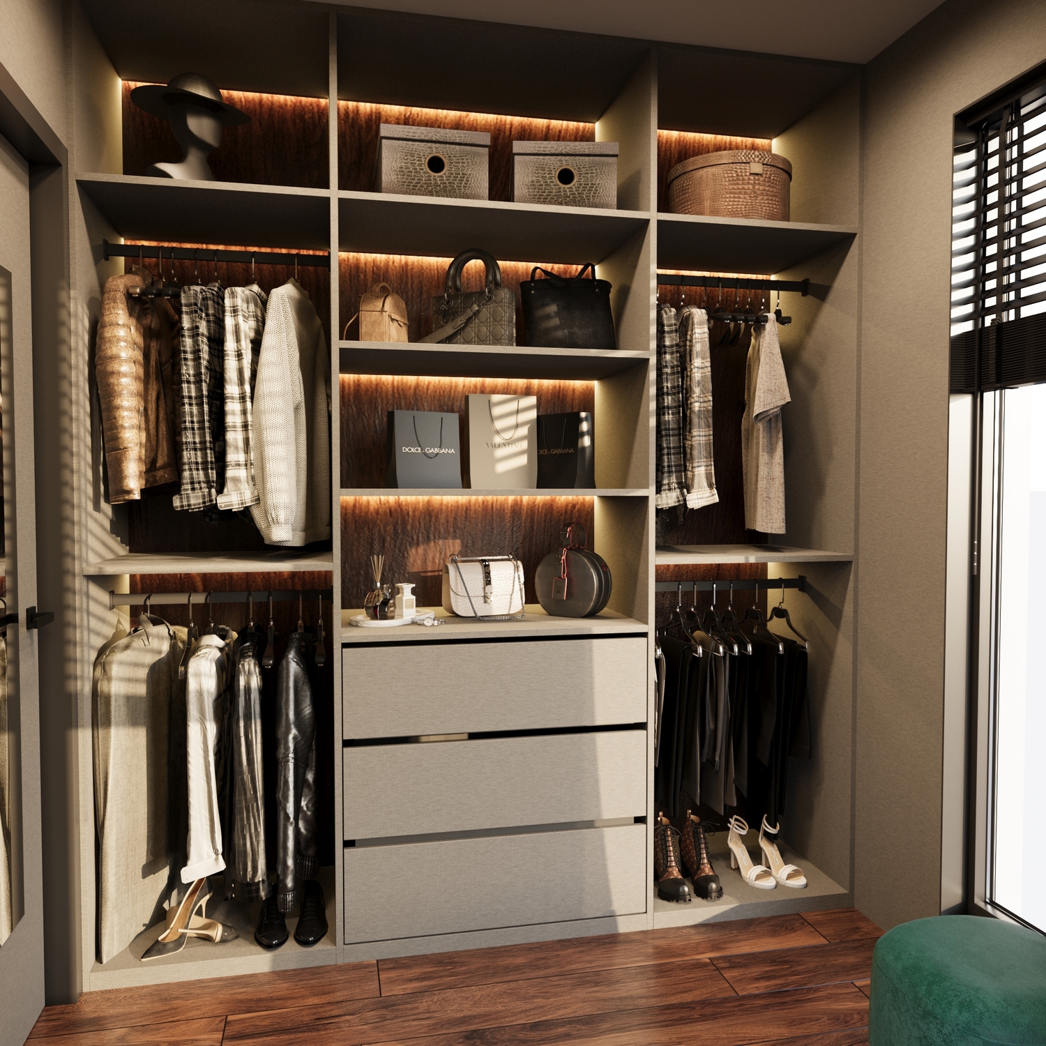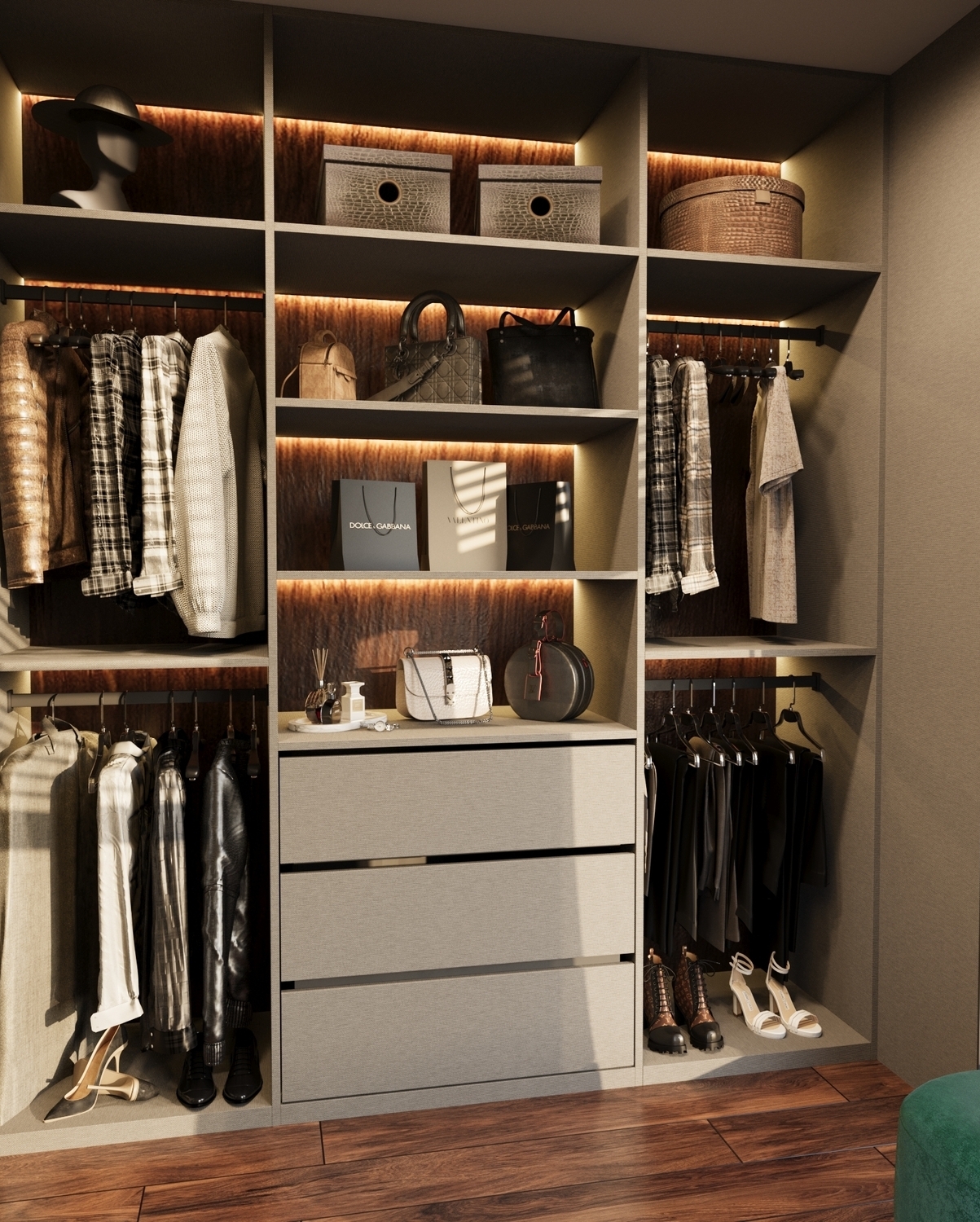 - Гардероб - Просторная гардеробная комната с продуманной системой хранения. Закрытые секции и открытые полки позволяют удобно организовать вещи, а тёплое освещение придаёт пространству комфорт.