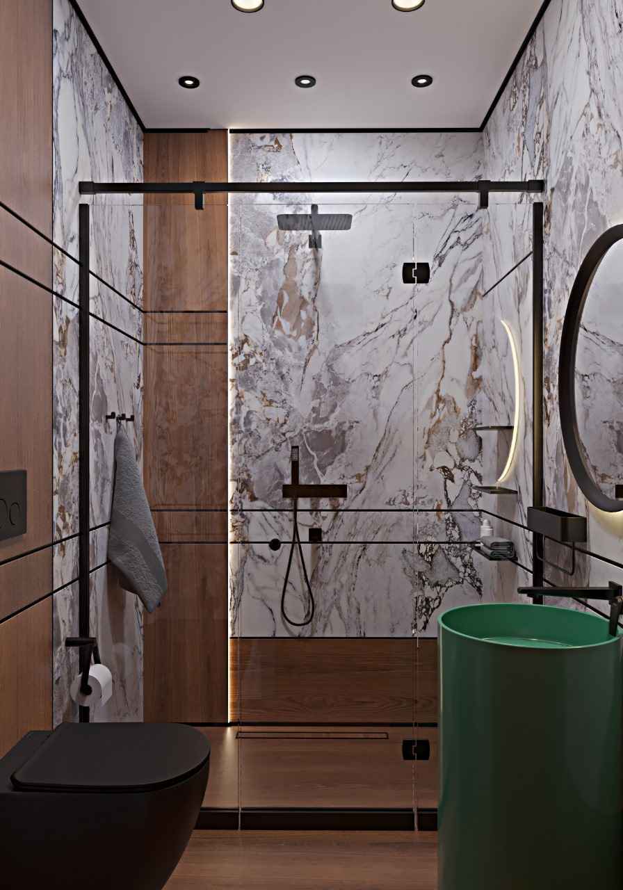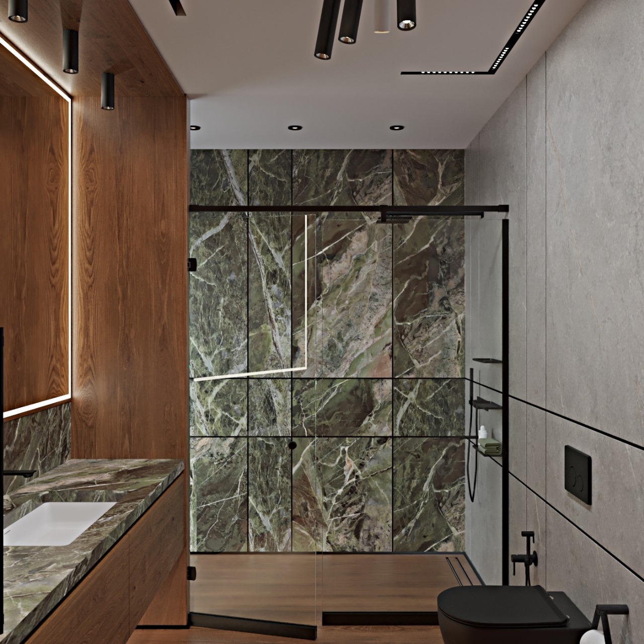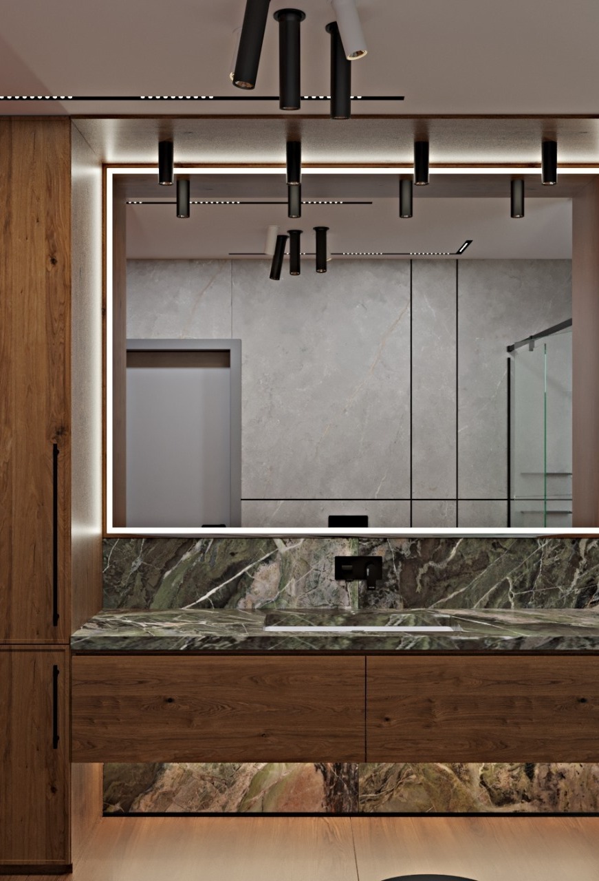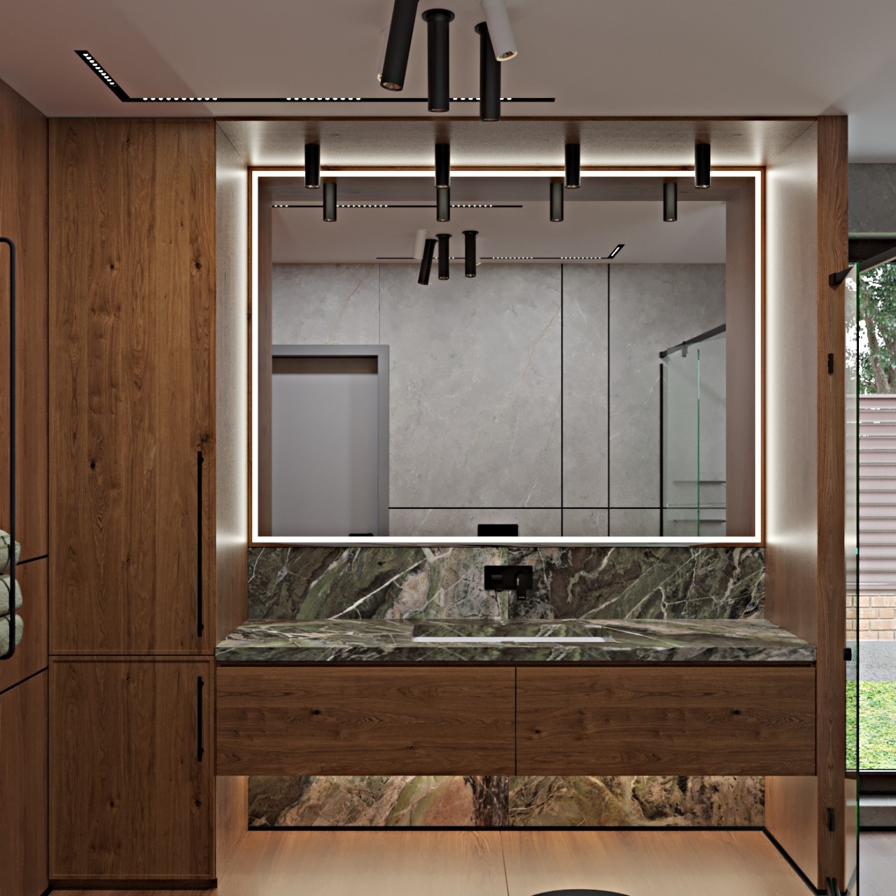 - Гостевой санузел — Компактное, но изысканное пространство с минималистичной отделкой. Натуральный камень, тёплая подсветка и современная сантехника создают ощущение уюта и чистоты.