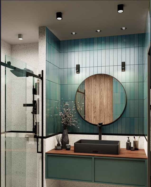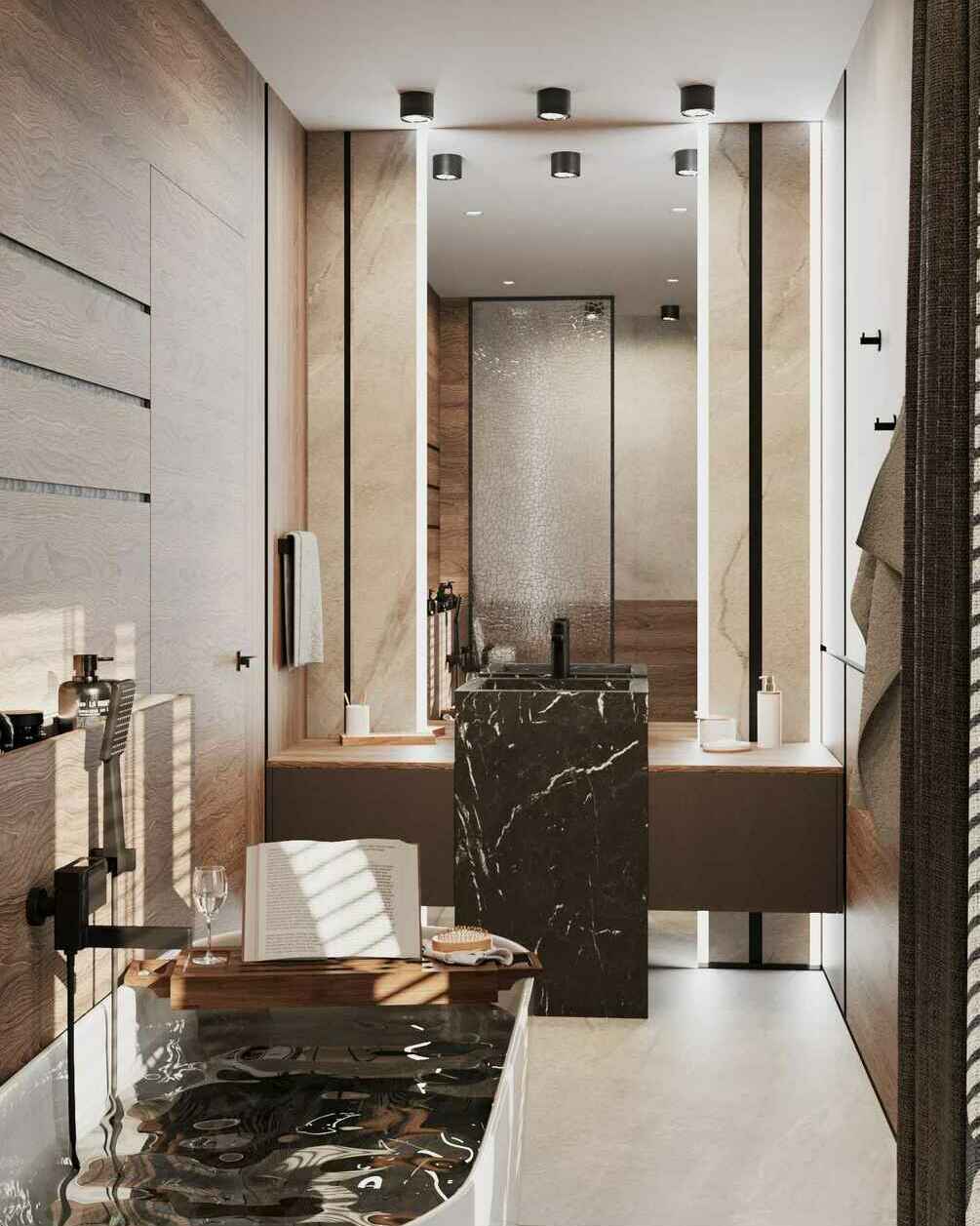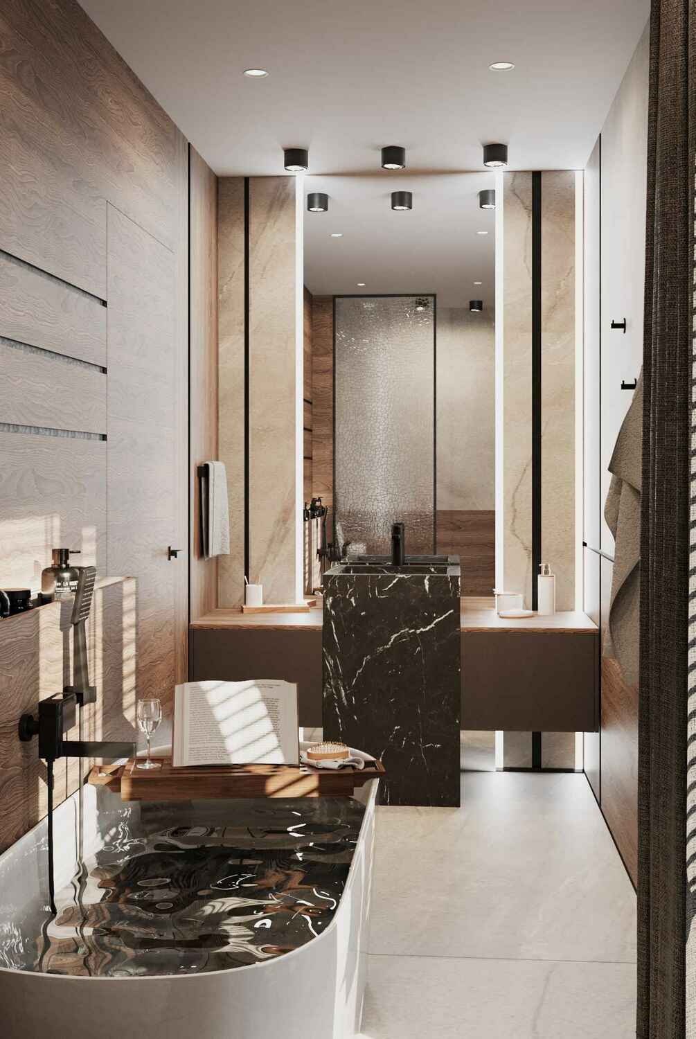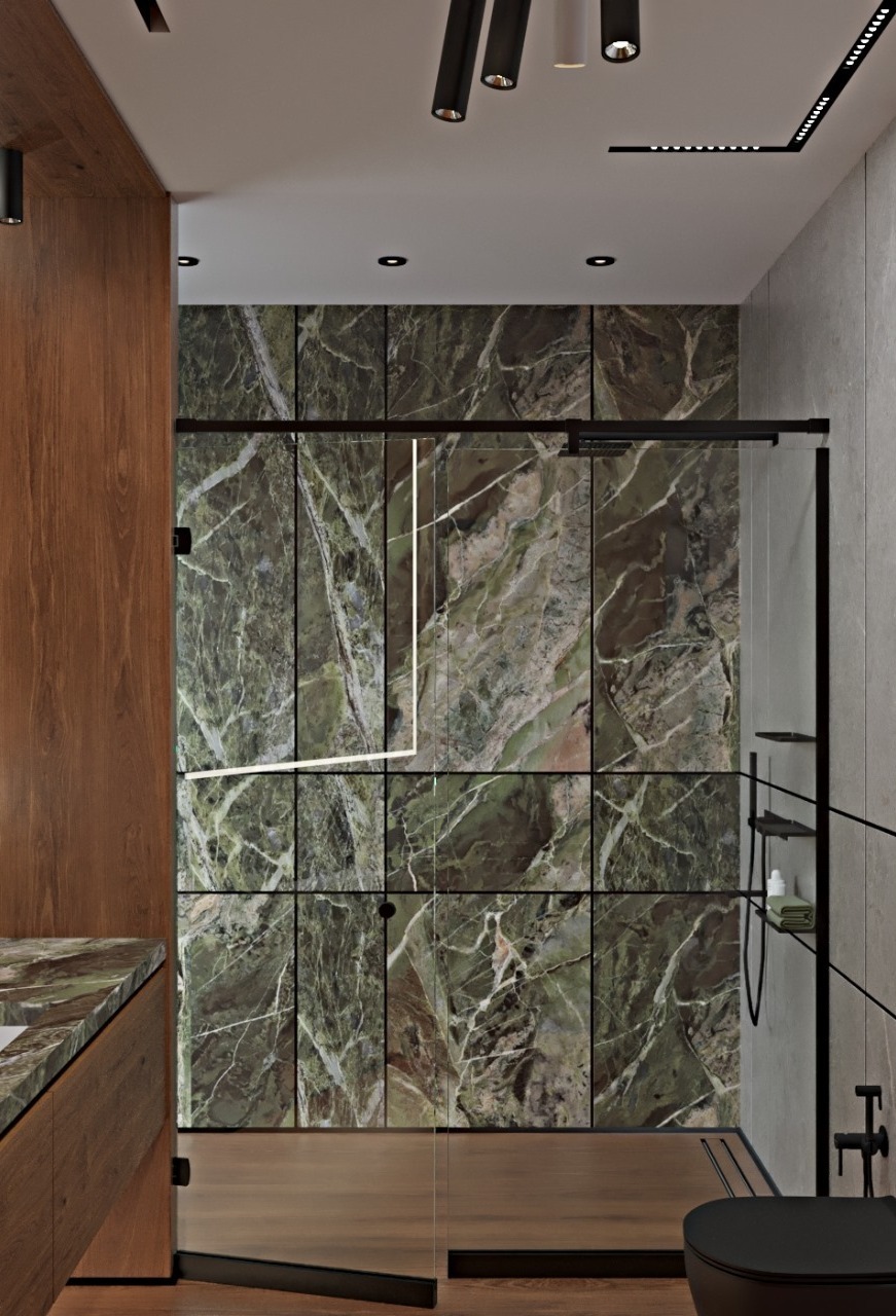 - Гостевой санузел — Компактное, но изысканное пространство с минималистичной отделкой. Натуральный камень, тёплая подсветка и современная сантехника создают ощущение уюта и чистоты.