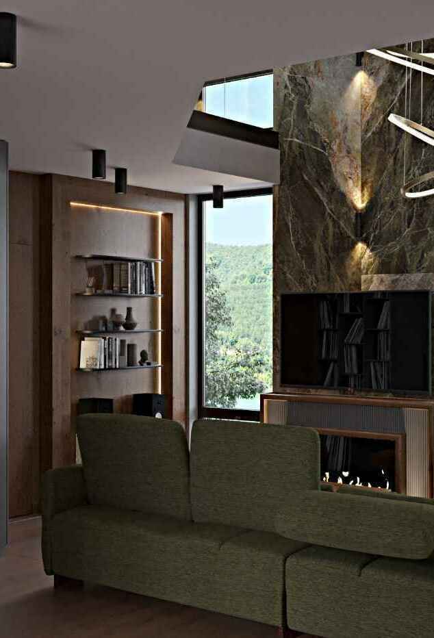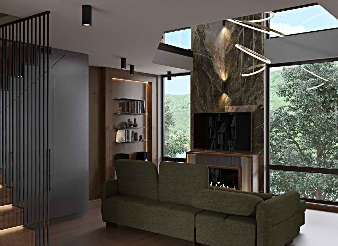 - Гостиная — Просторная гостиная с панорамными окнами, наполненная естественным светом. Центром композиции является мягкая зона с диваном и камином, где можно проводить уютные вечера. Декор выдержан в спокойных, природных тонах, которые гармонируют с видом за окном.