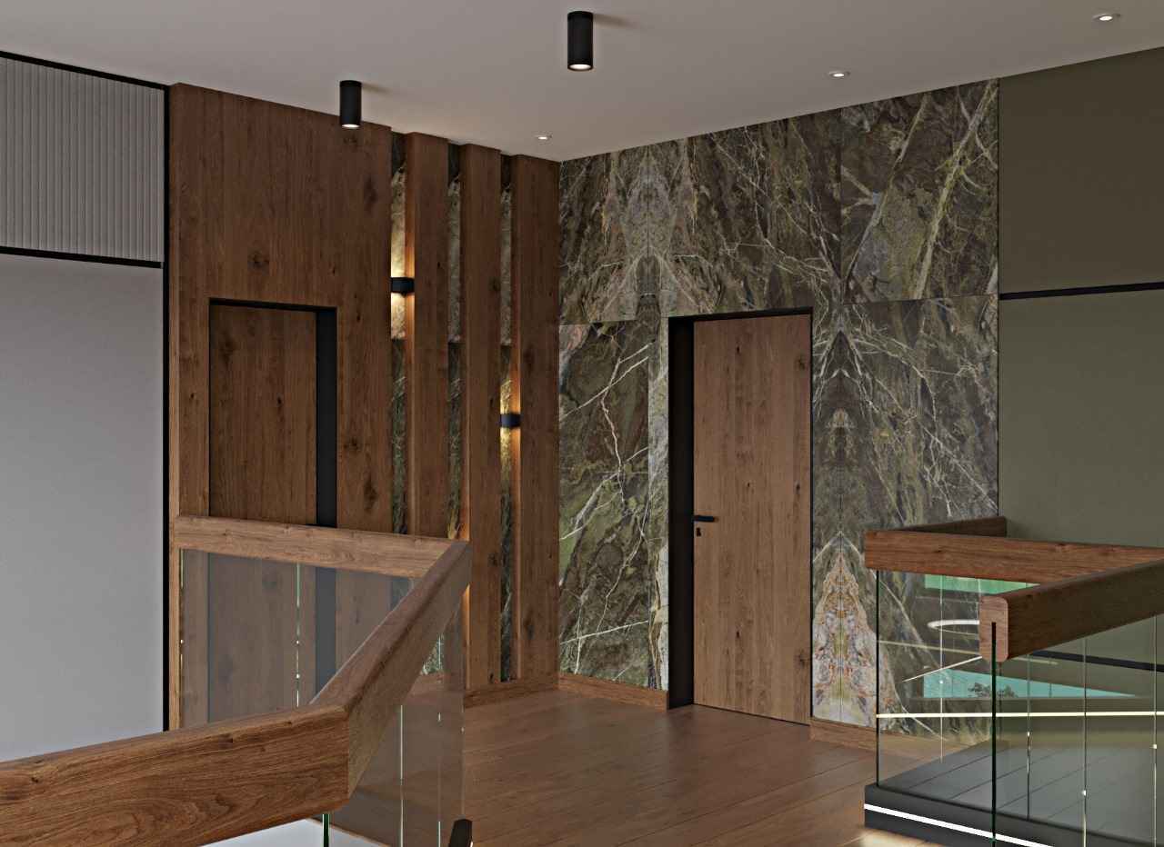 - Холл - Светлый холл с удобным доступом ко всем комнатам этажа. Панорамное окно наполняет пространство дневным светом, а декоративные элементы и мягкое ковровое покрытие создают атмосферу уюта.