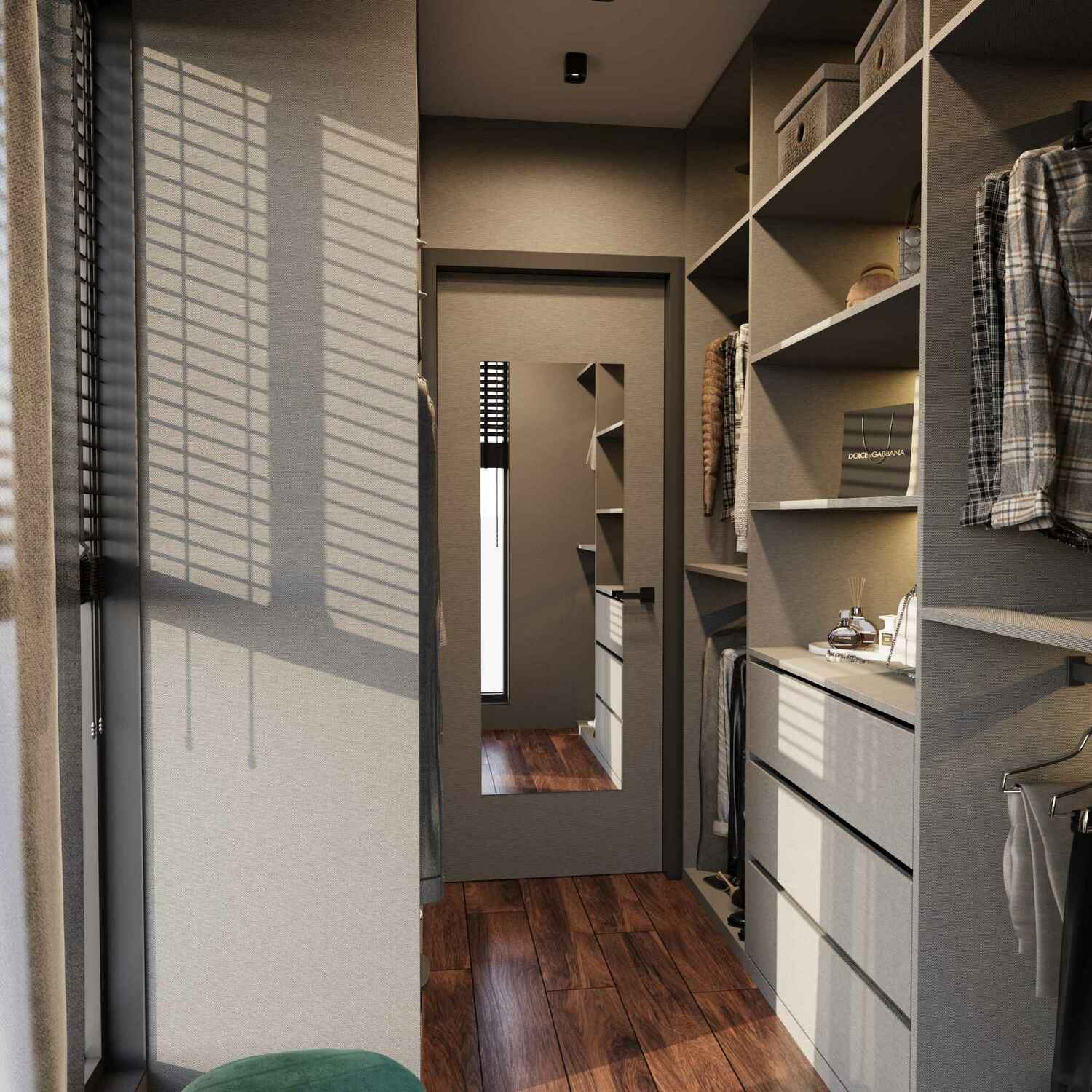 - Спальня с душем и гардеробом - Просторная спальня, объединённая с приватной зоной душа и отдельной гардеробной. Такое зонирование обеспечивает максимальный комфорт и приватность, а мягкие оттенки и натуральные материалы подчёркивают домашнее тепло.