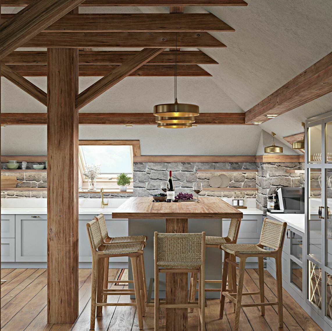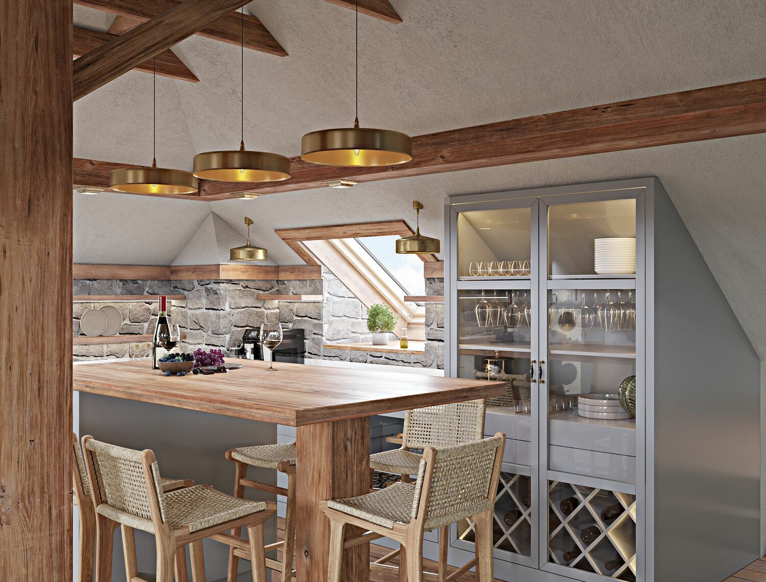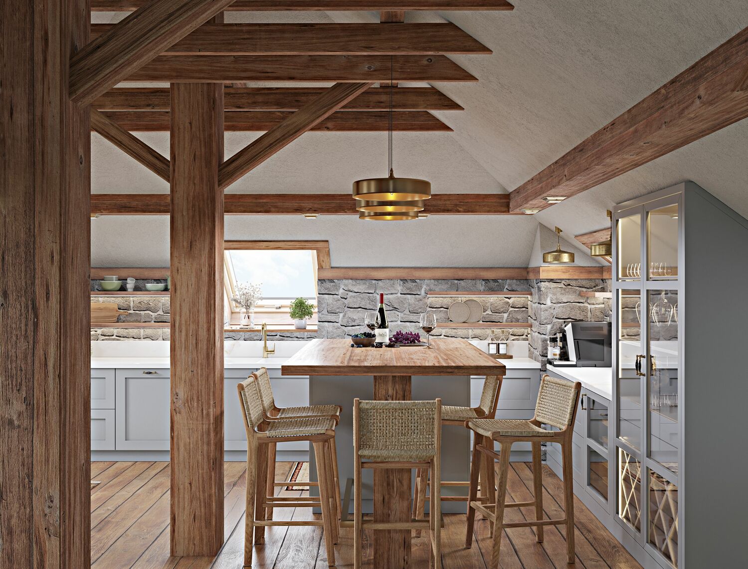 - Кухня — Функциональная и стильная кухня с островом, объединённая с обеденной зоной. Натуральные материалы и тёплая цветовая гамма создают атмосферу уюта, а продуманная эргономика позволяет готовить с комфортом.