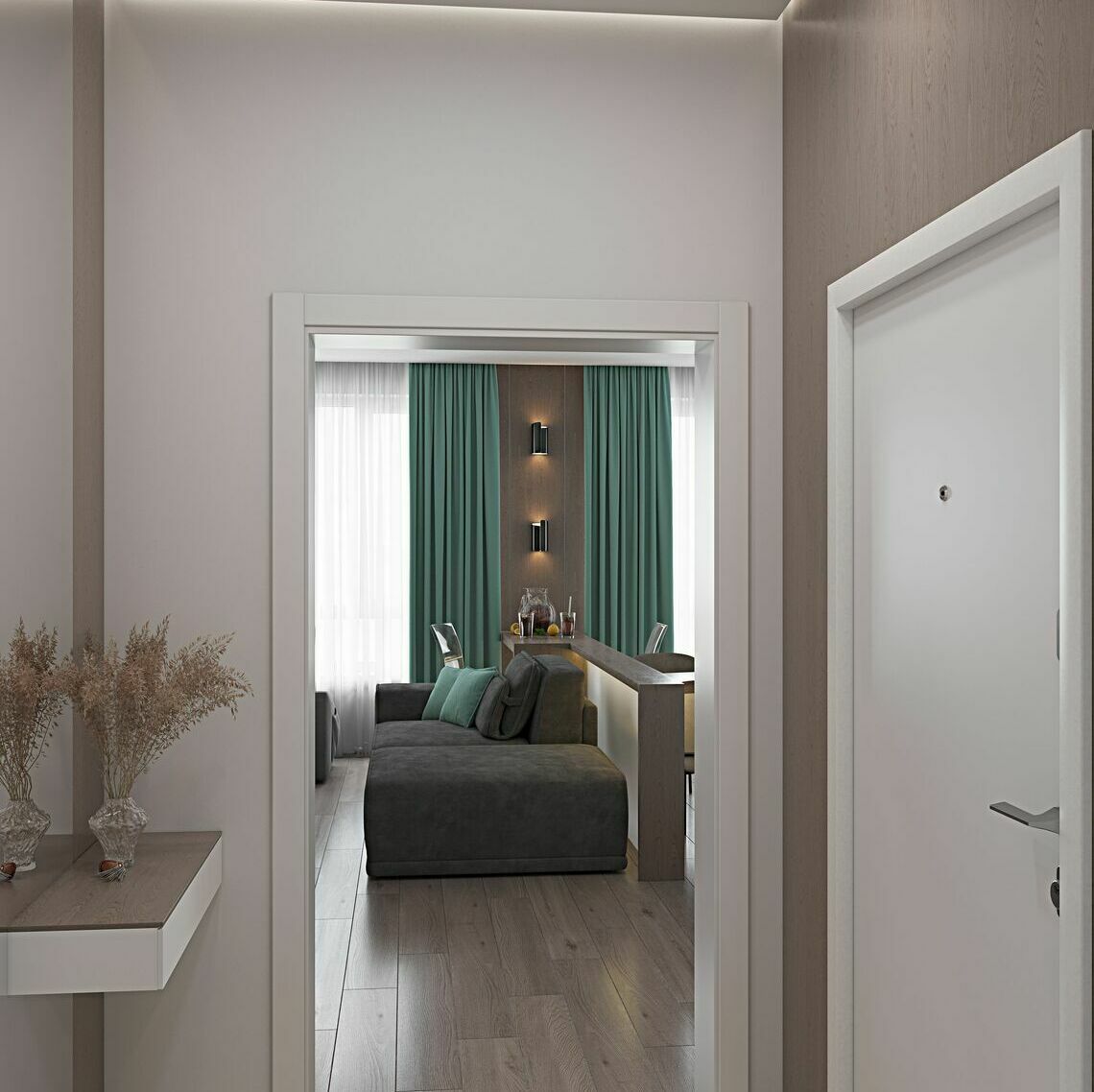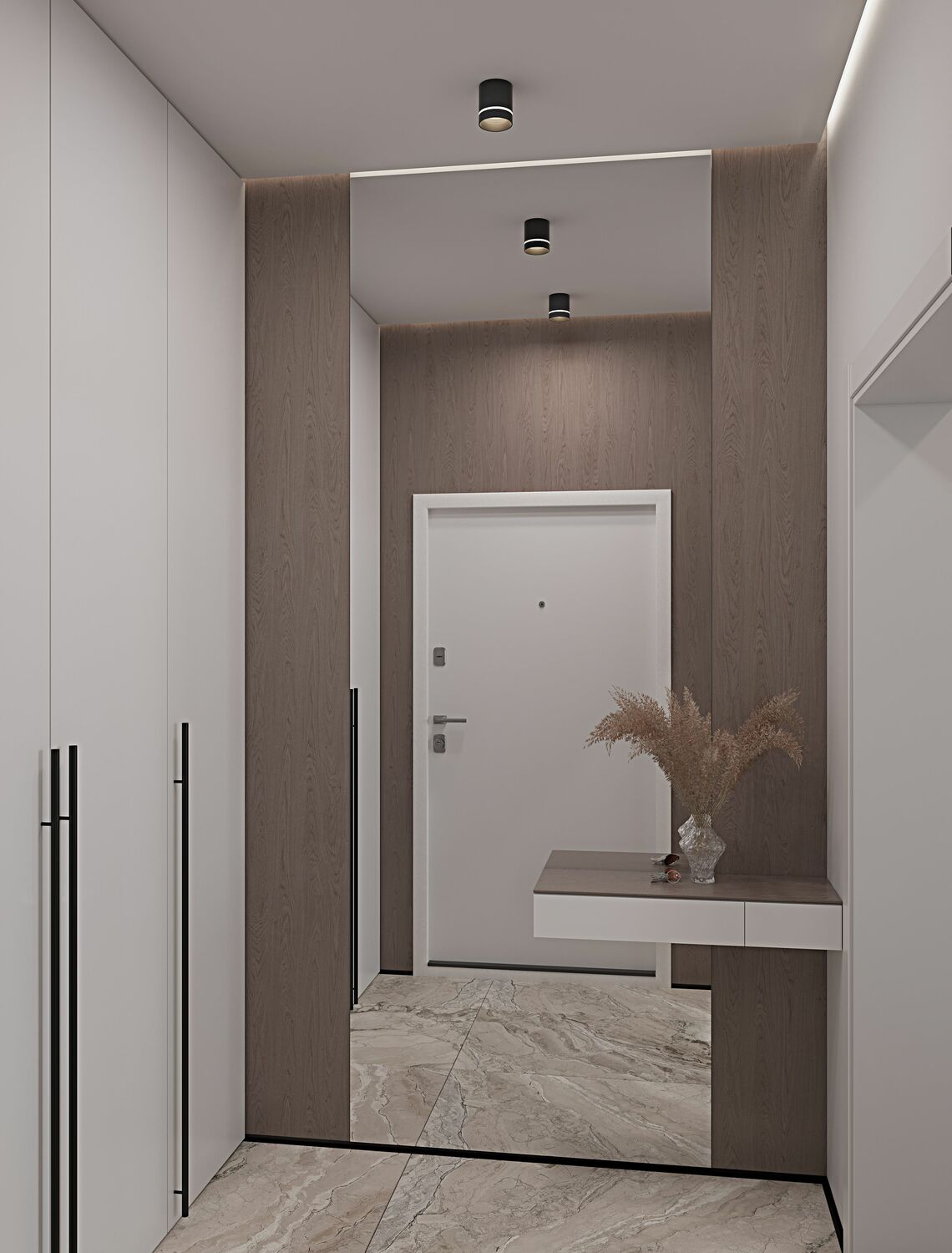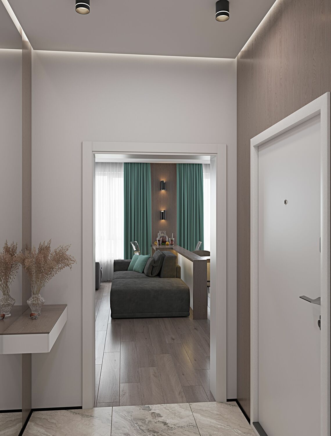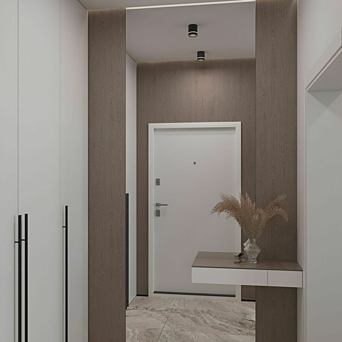 В проходной зоне предусмотрены панели на стенах в которых спрятаны двери скрытого монтажа .