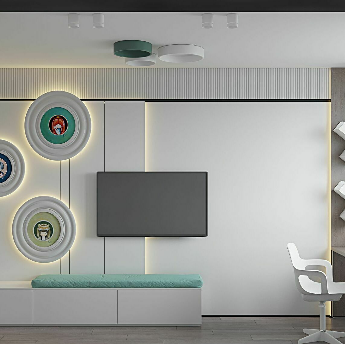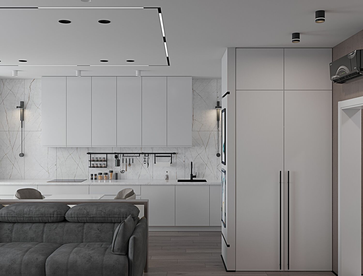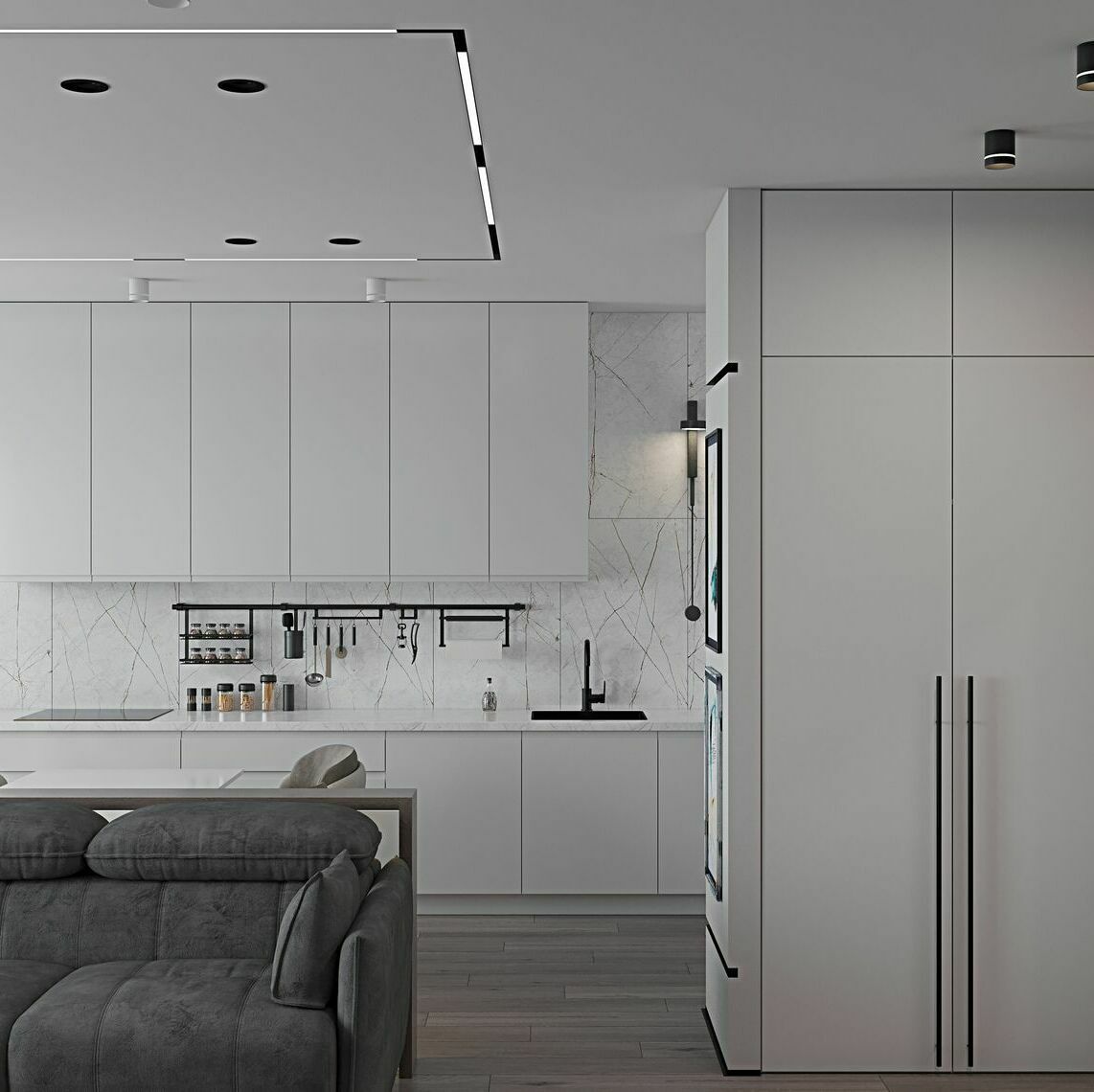 В проходной зоне предусмотрены панели на стенах в которых спрятаны двери скрытого монтажа .