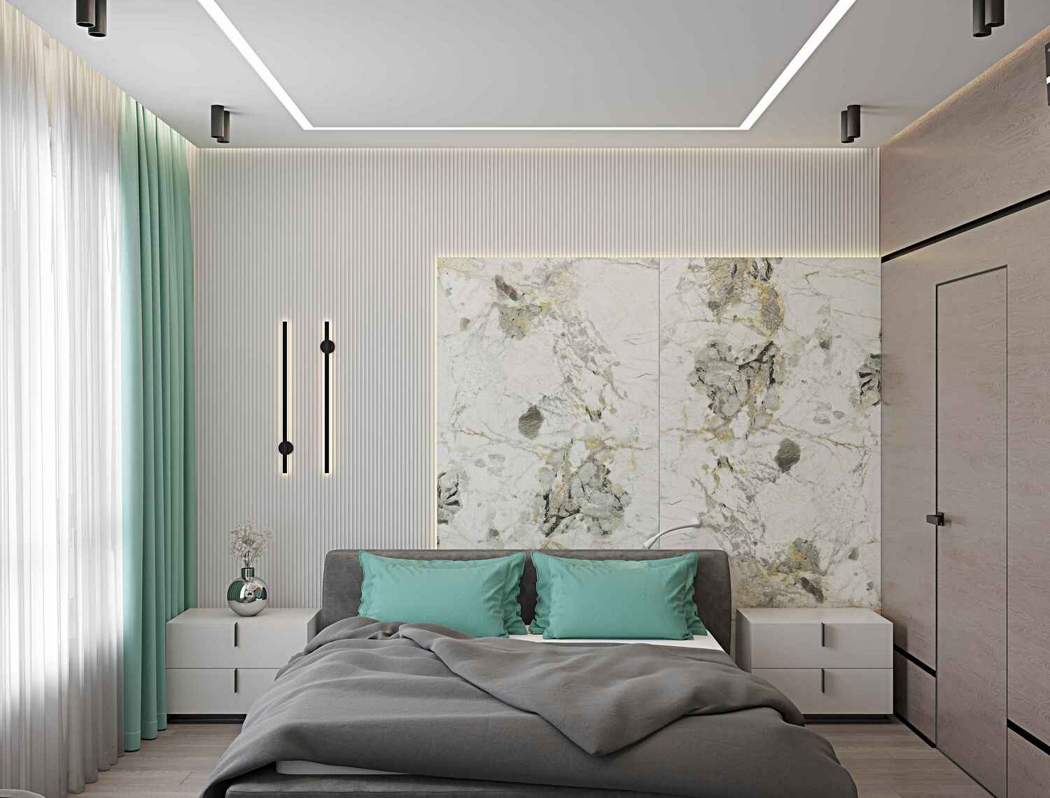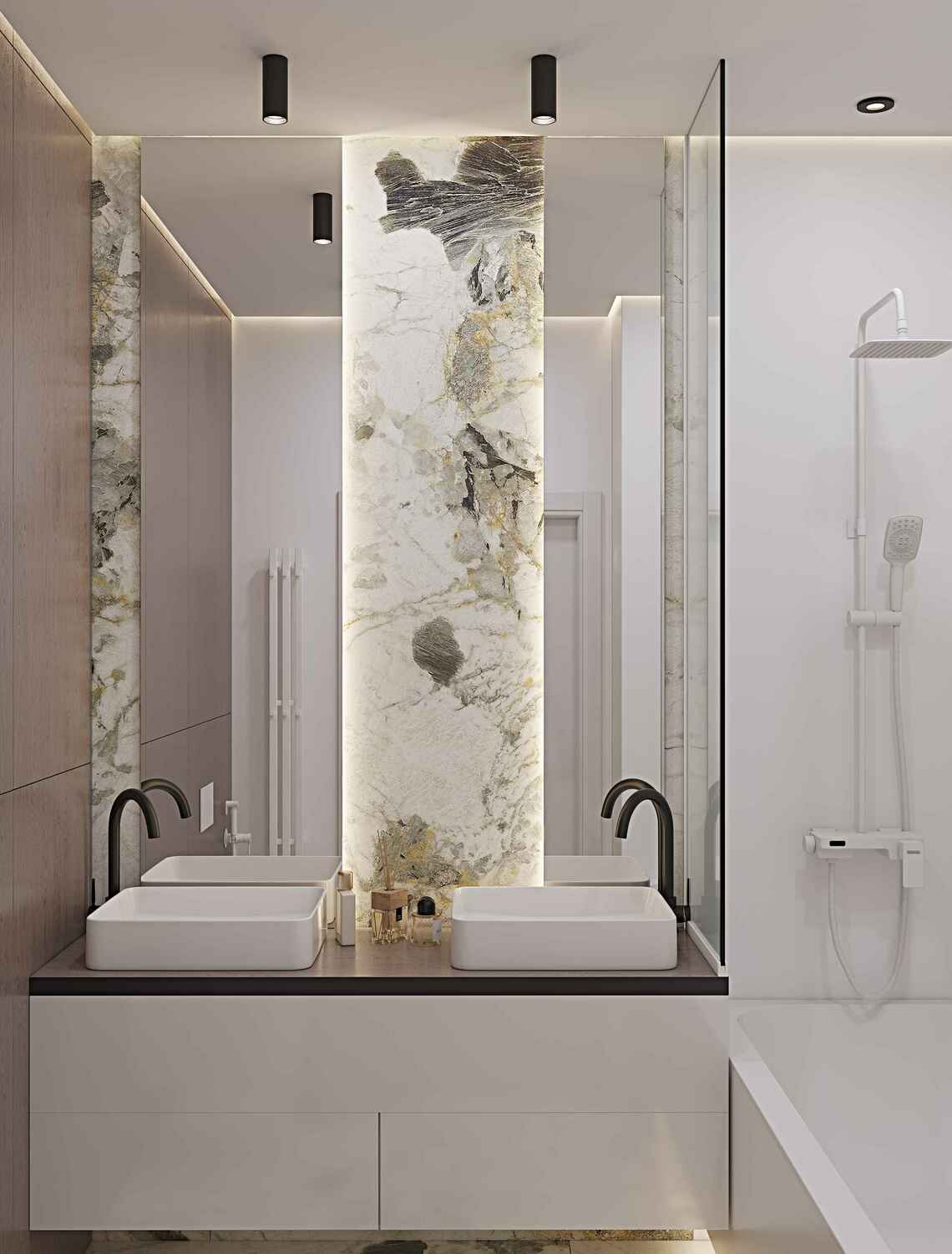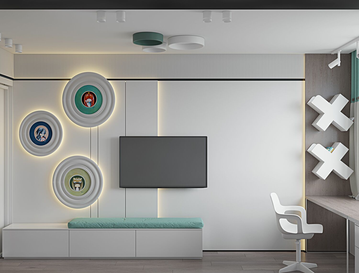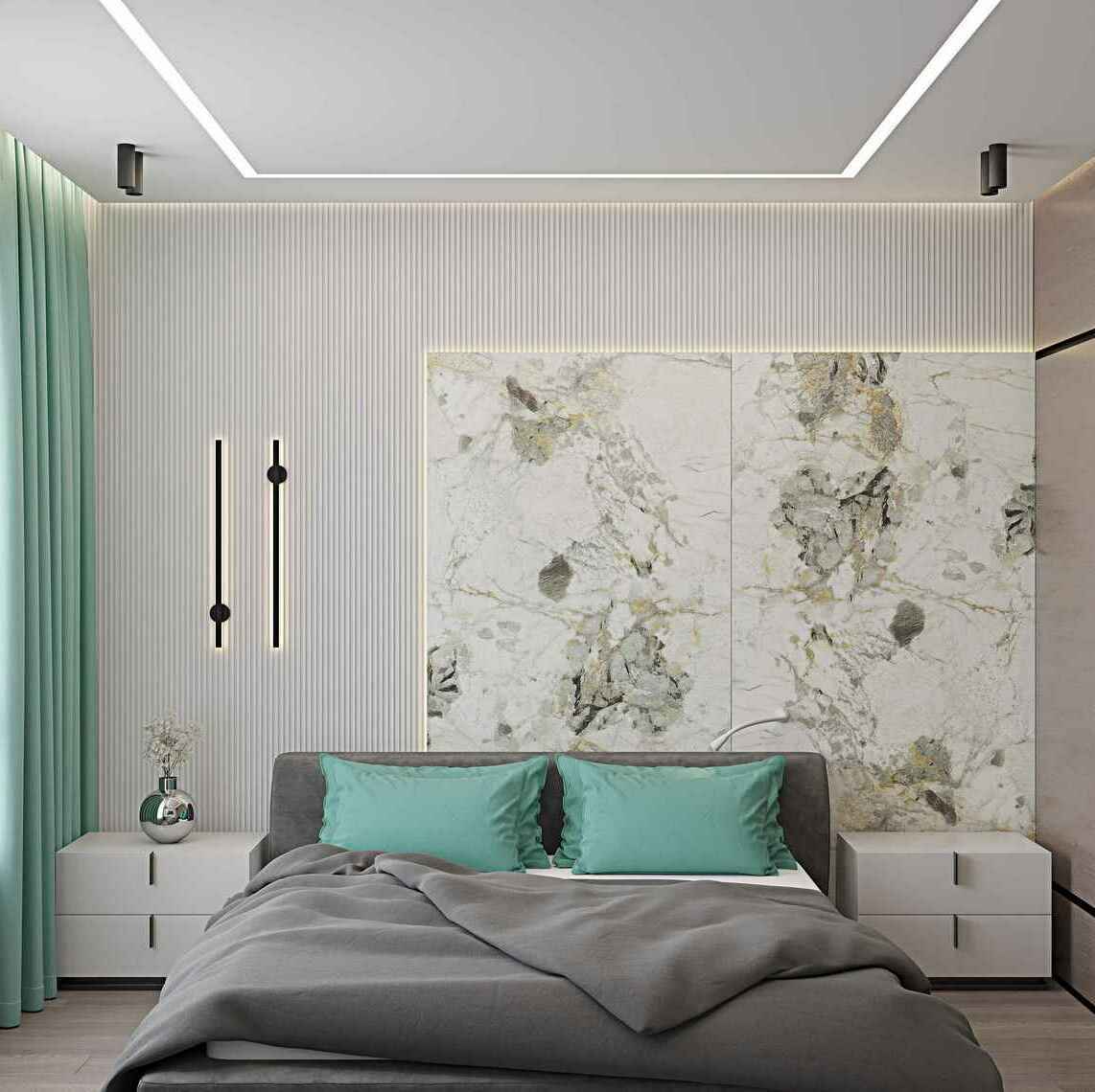 В проходной зоне предусмотрены панели на стенах в которых спрятаны двери скрытого монтажа .
