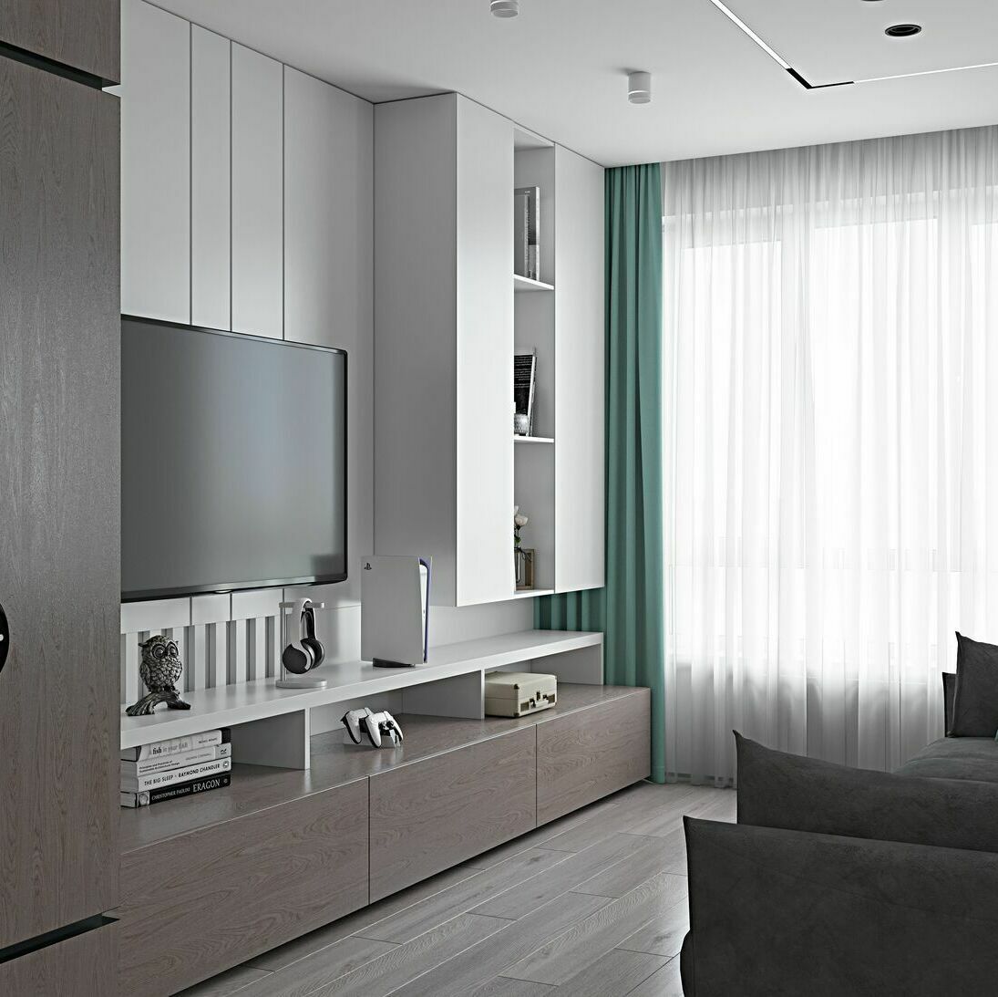 За перегородкой скрывается целый мир: компактный диван-кровать днем и уютное спальное место ночью. Рядом небольшая, но продуманная гардеробная, где теперь помещается вся детская одежда и игрушки.