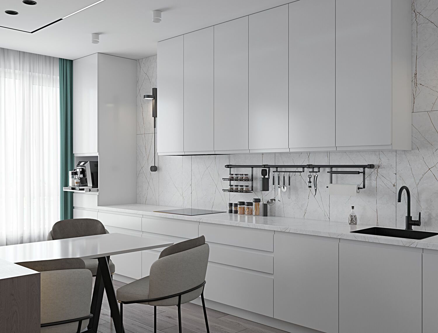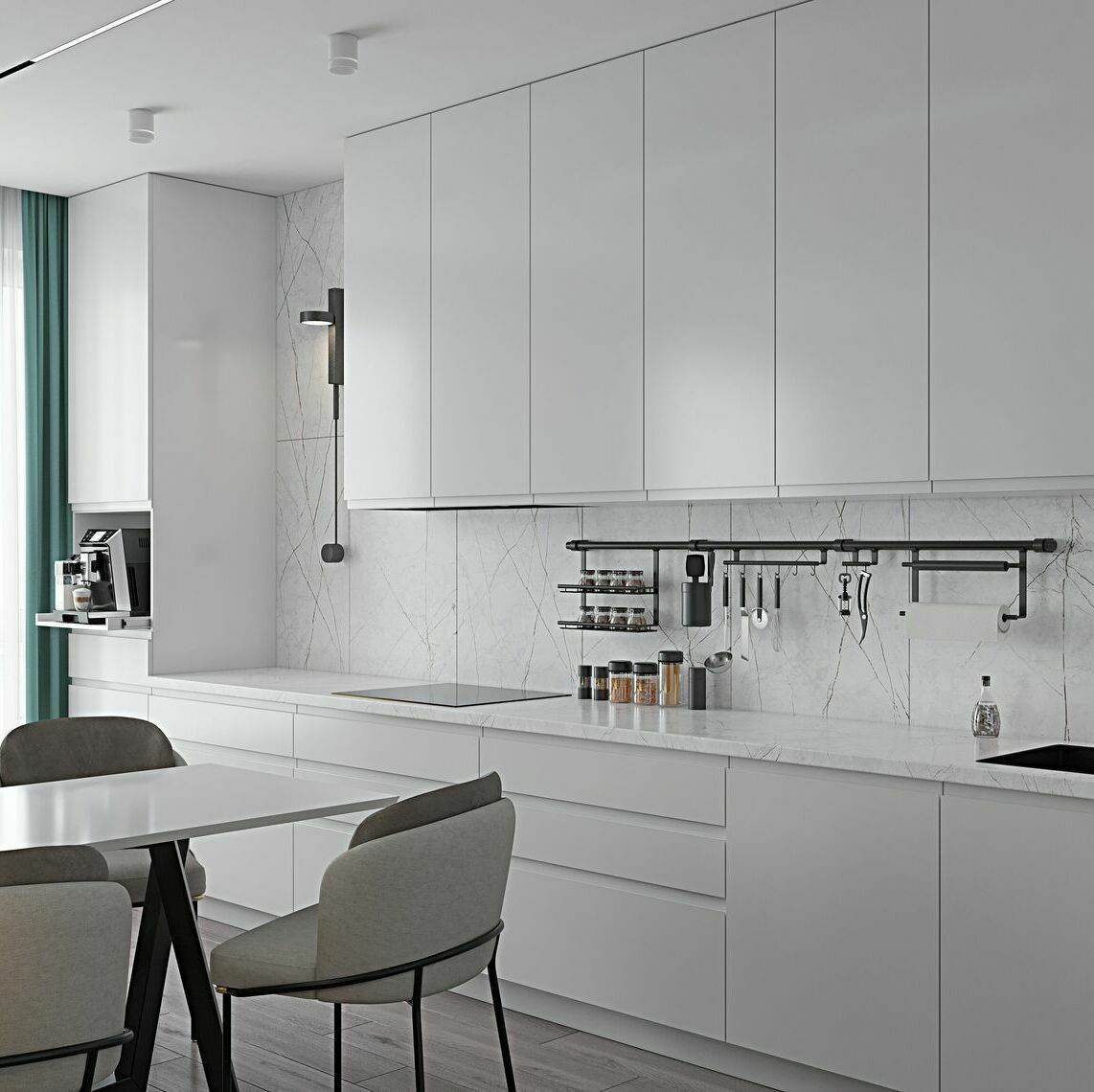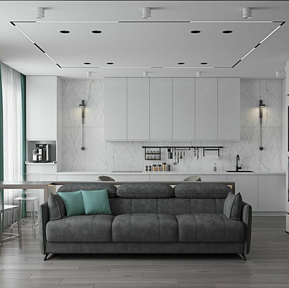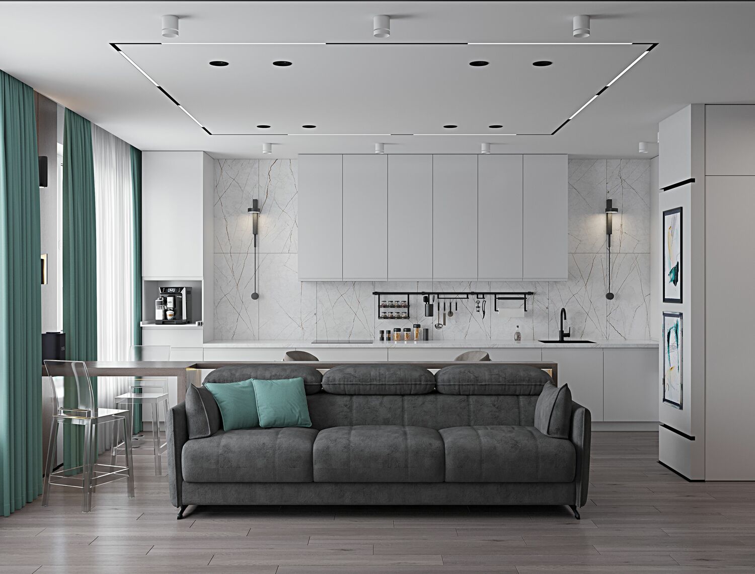 Главной находкой проекта стала барная стойка из массива дуба, которая плавно "вытекает" из пространства между окон. Она не просто зонирует пространство — утром здесь пьют кофе, днем работают за ноутбуком, а вечером устраивают дружеские посиделки. Но настоящий секрет скрыт за фасадом соседнего шкафа — там, где никто не ожидает, разместилась полноценная постирочная с техникой и системами хранения.