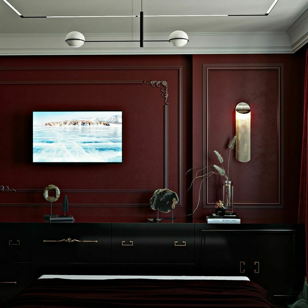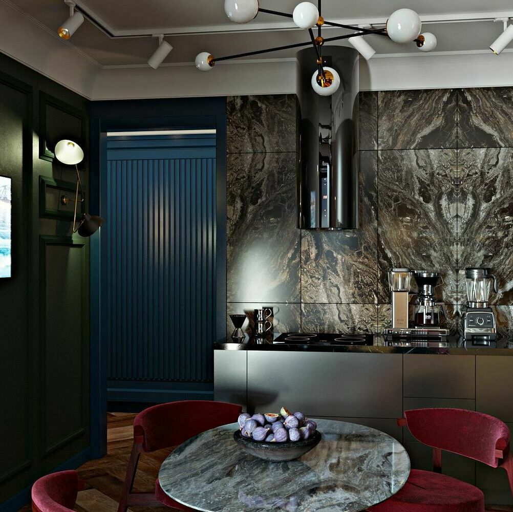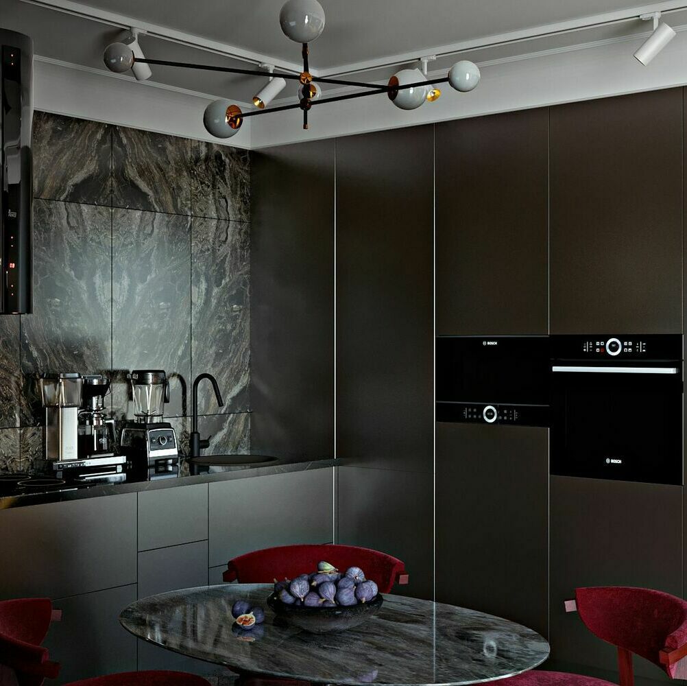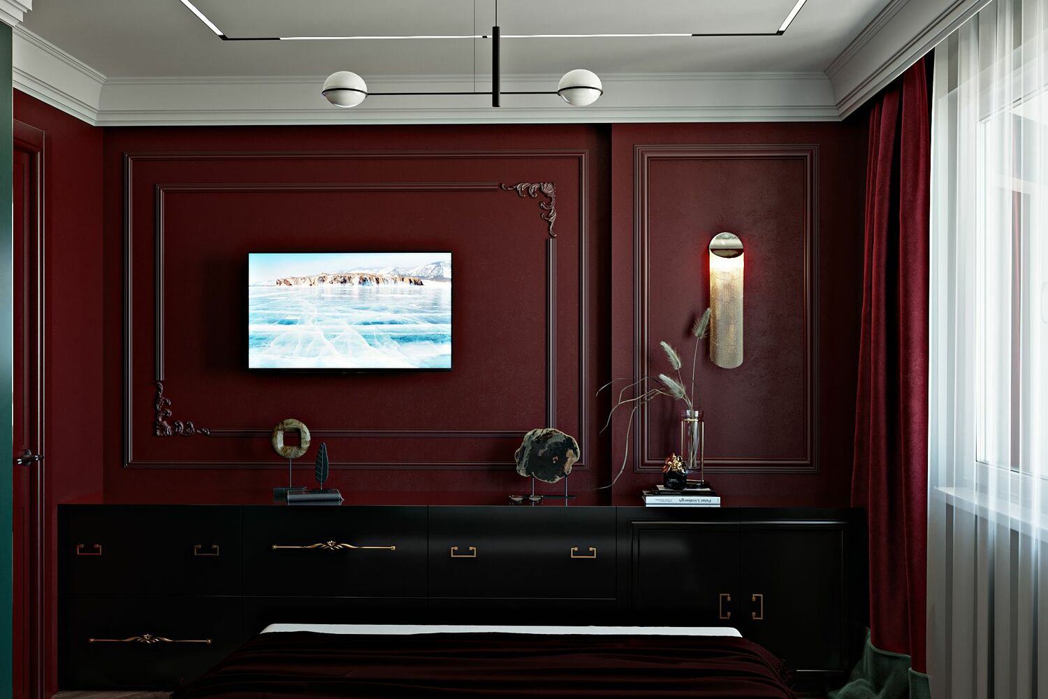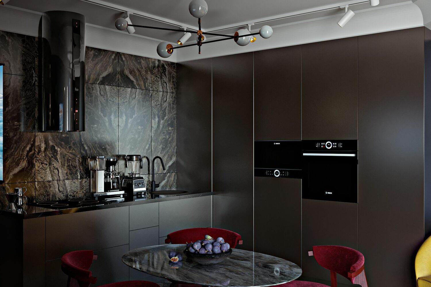 Заказчики хотели необычный интерьер в темных глубоких тонах.